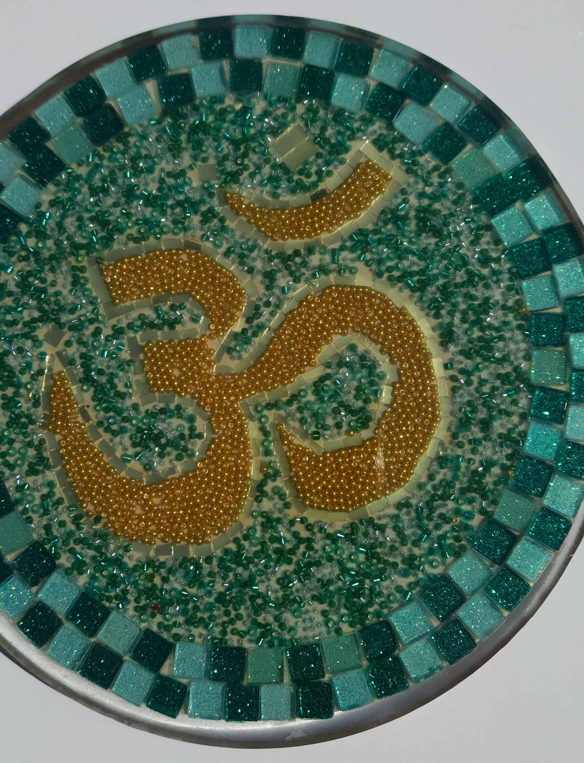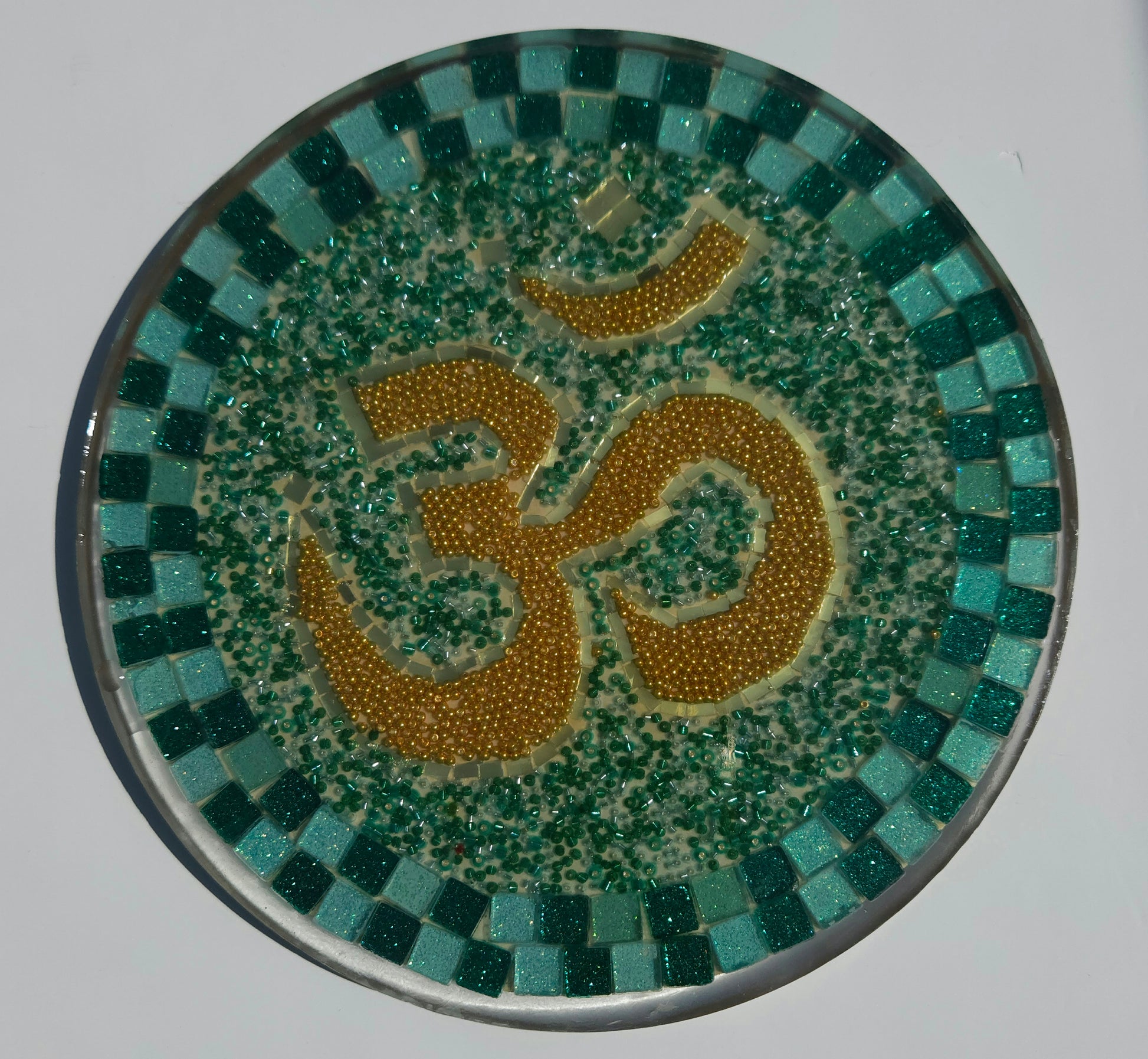 Channel divine energy and timeless beauty with this handcrafted Om mosaic disc. Designed with intricate detail, each piece is a vibrant blend of shimmering resin, delicate beads, and hand-laid mosaic tiles that radiate spiritual elegance. The sacred ॐ (Om) symbol—representing universal consciousness and inner peace—sits powerfully at the center, drawing in light, serenity, and positive energy.
