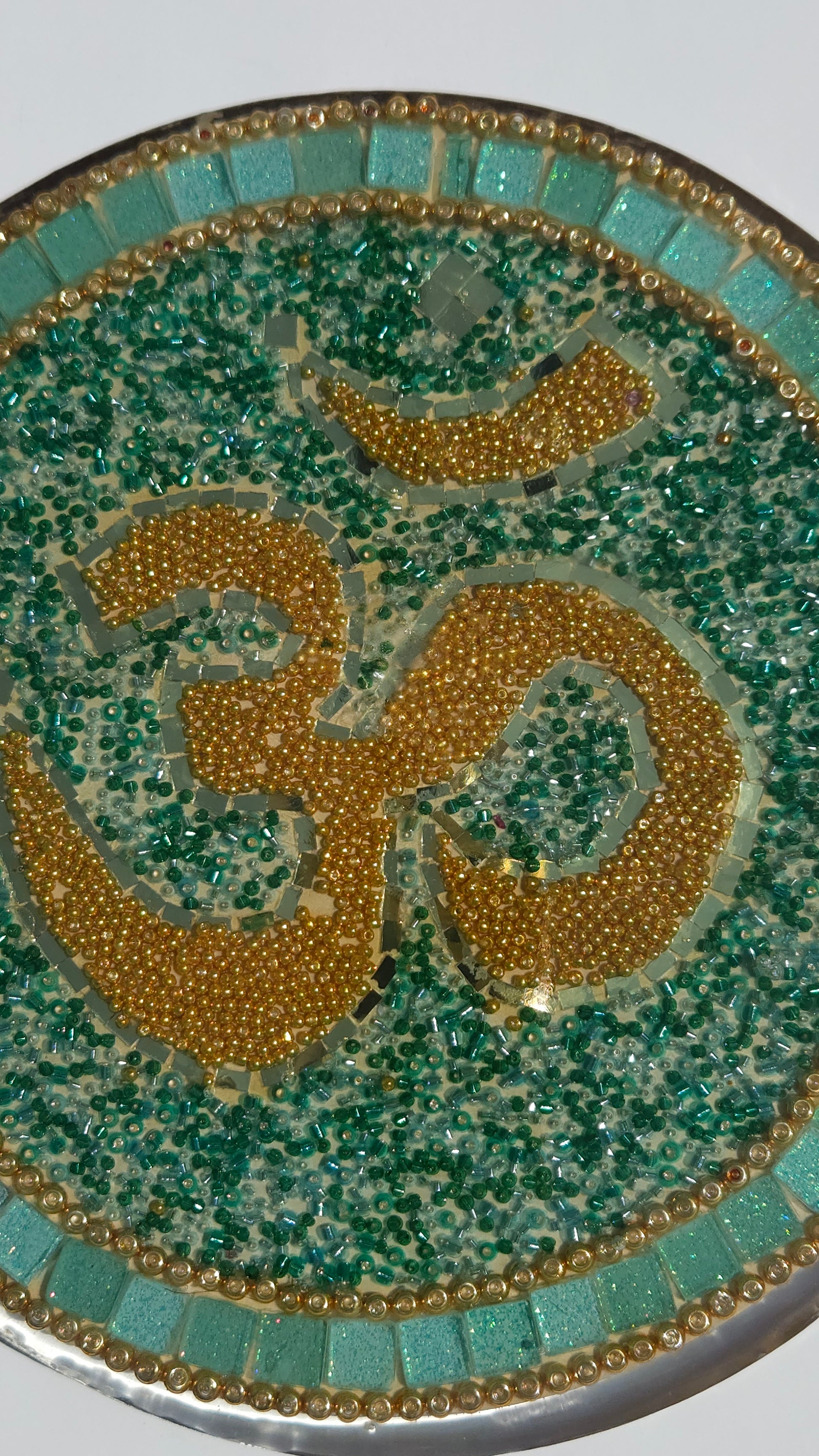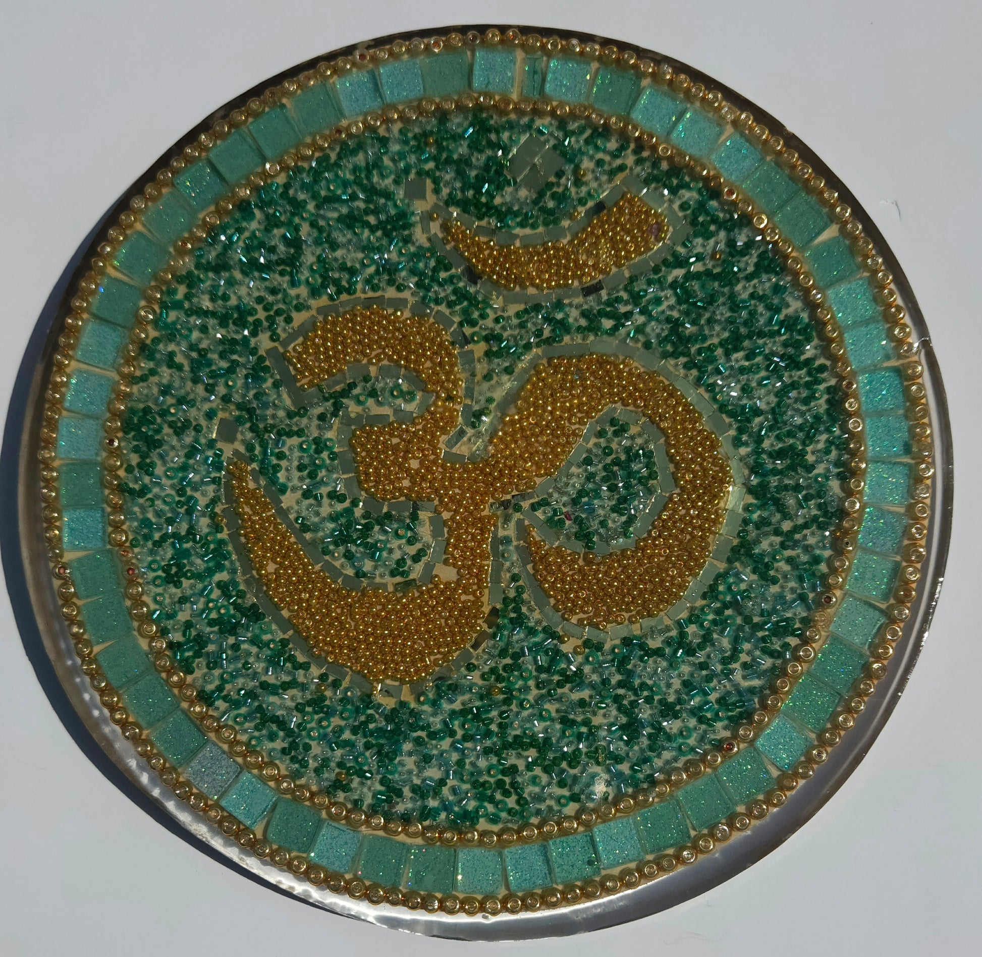 Channel divine energy and timeless beauty with this handcrafted Om mosaic disc. Designed with intricate detail, each piece is a vibrant blend of shimmering resin, delicate beads, and hand-laid mosaic tiles that radiate spiritual elegance. The sacred ॐ (Om) symbol—representing universal consciousness and inner peace—sits powerfully at the center, drawing in light, serenity, and positive energy.