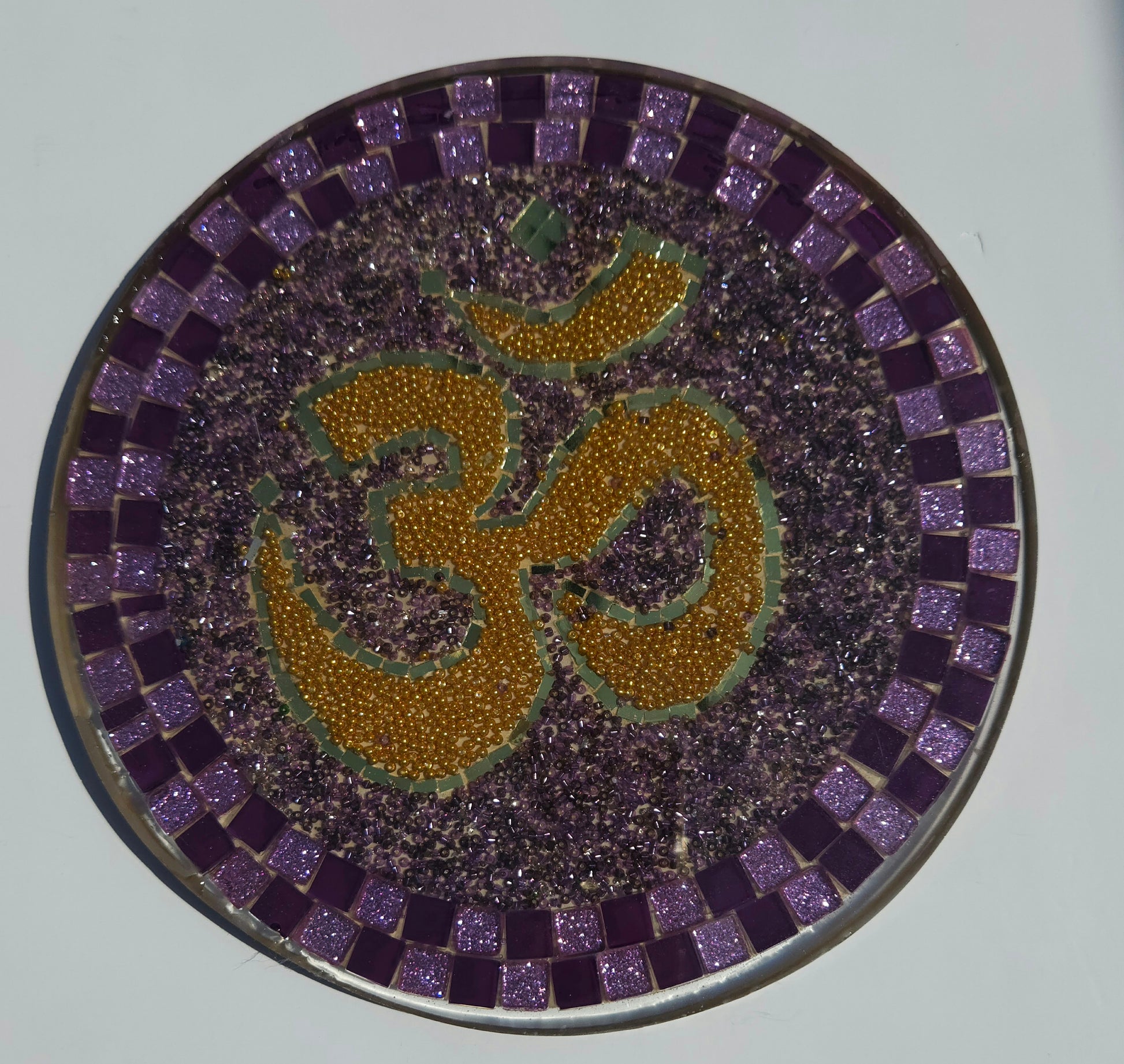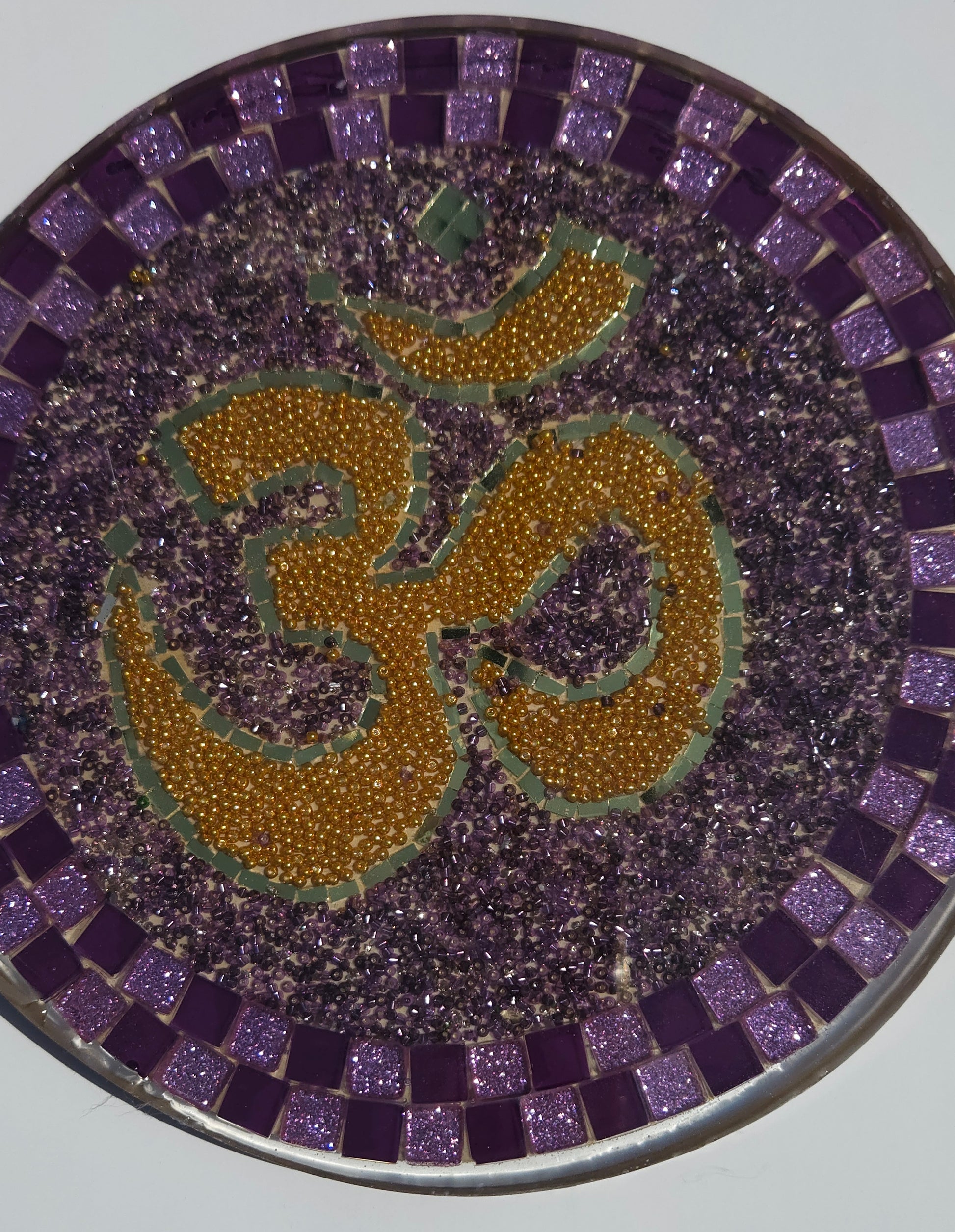 Handcrafted Om 🕉️ Mosaic Wall Art – Resin, Beads & Glass Tile Purple Glow