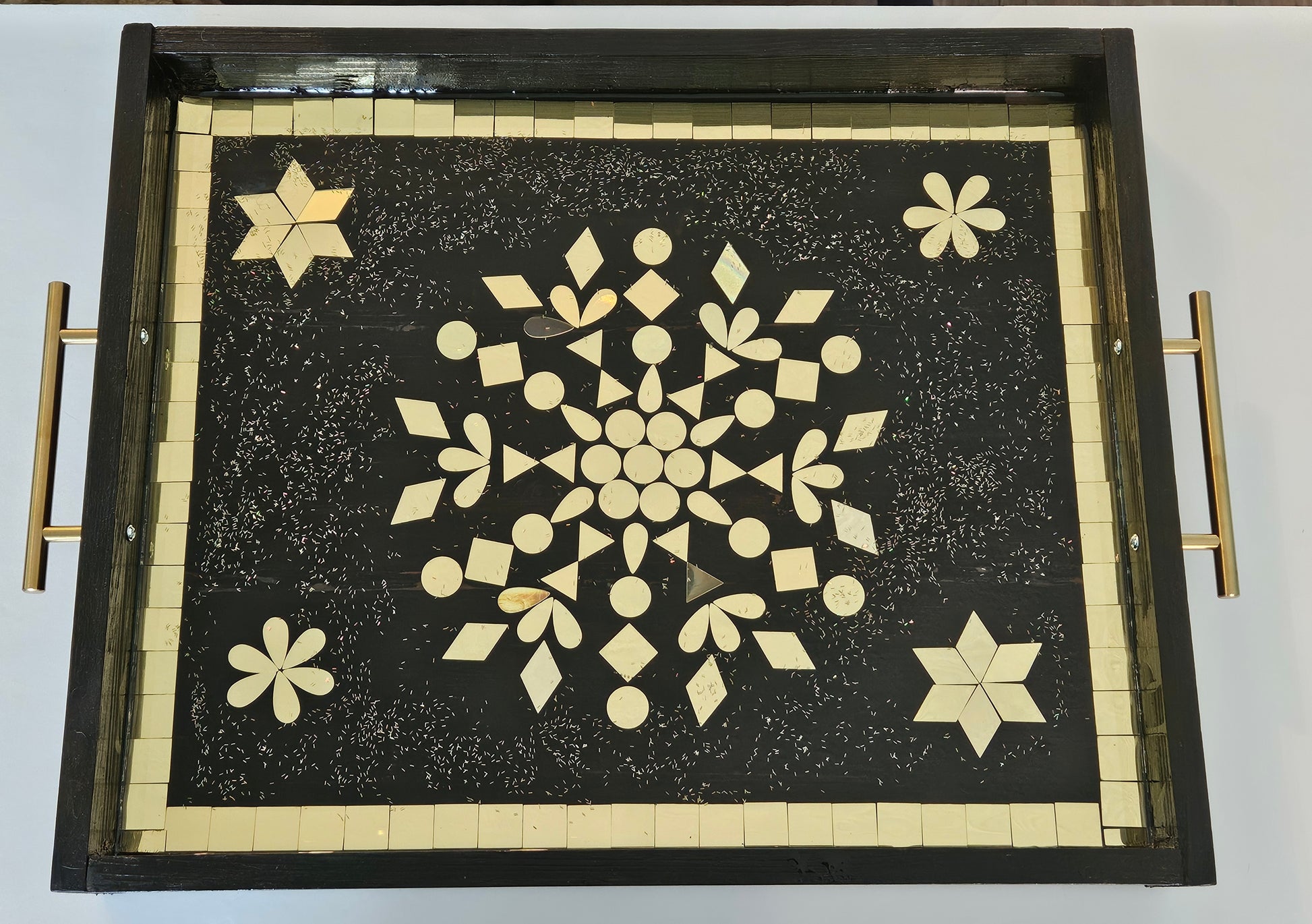Set against a jet-black resin background with embedded golden glitter, the design sparkles subtly under light—adding a sense of depth and richness. A border of square gold tiles frames the tray, while sturdy brass metal handles complete the upscale look.