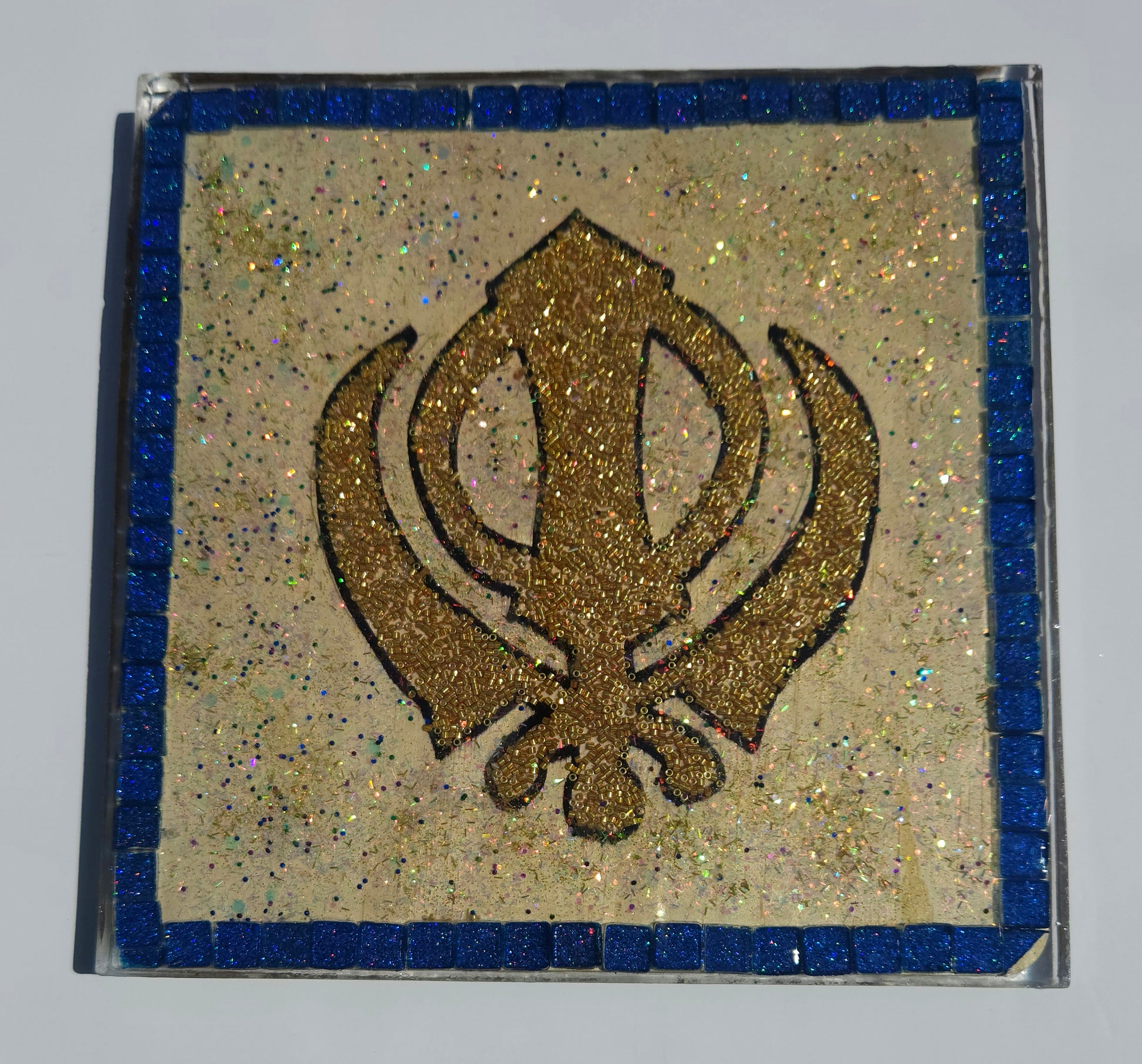 Celebrate faith and tradition with this radiant Khanda Wall Art, a sacred emblem of Sikhism. This handmade piece features a gold Khanda symbol outlined with intricate black beading, set against a shimmering background and bordered by vibrant green mosaic tiles.