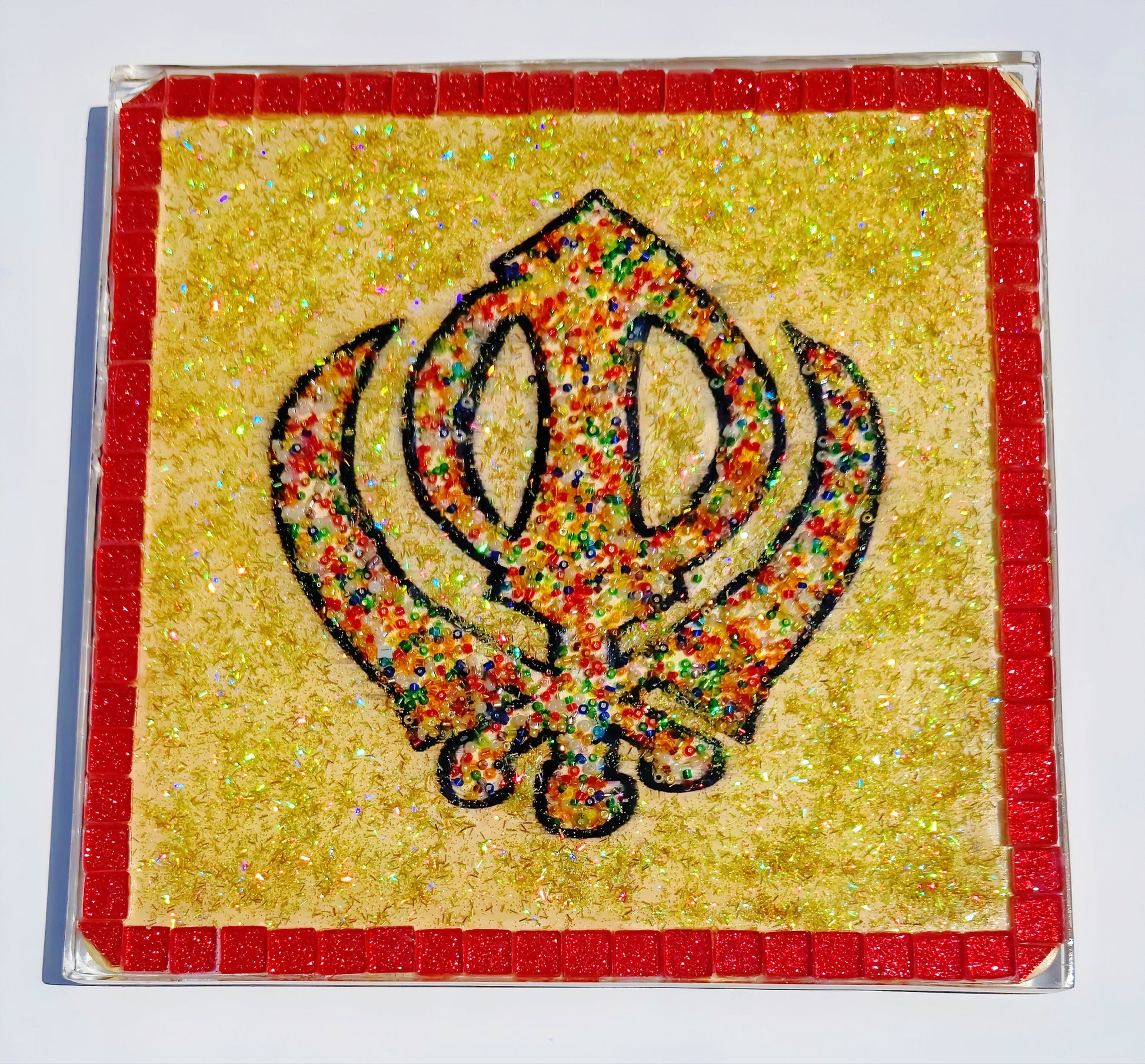 Celebrate faith and tradition with this radiant Khanda Wall Art, a sacred emblem of Sikhism. This handmade piece features a gold Khanda symbol outlined with intricate black beading, set against a shimmering background and bordered by vibrant green mosaic tiles.