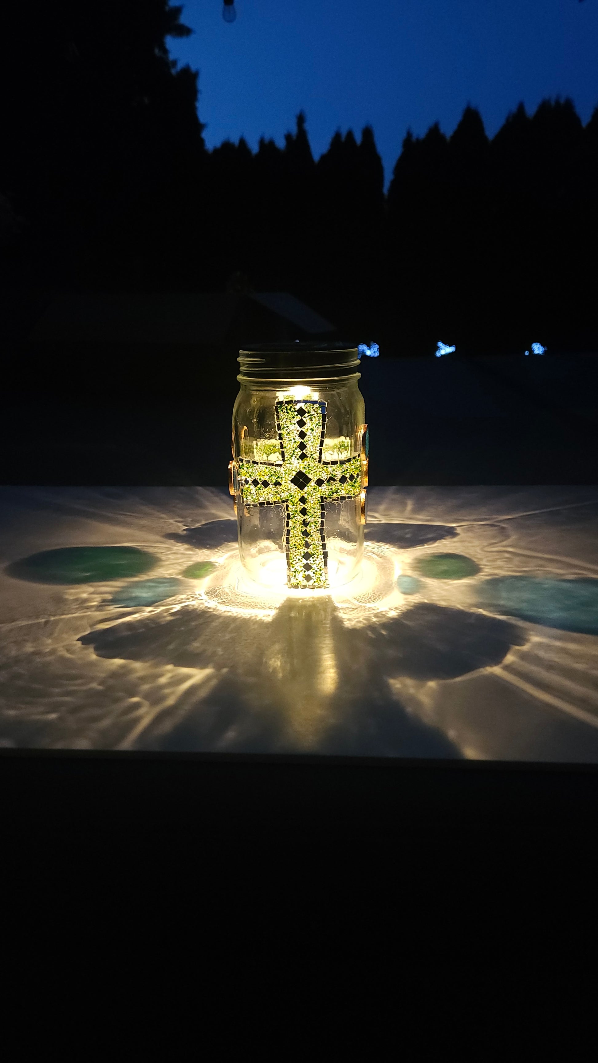Illuminate your space with this handcrafted mosaic solar light jar, featuring a radiant blue glass cross design set against a clear mason-style jar. The cross sparkles with hand-laid mosaic tiles in shimmering blue, mirrored silver, and black, enhanced by copper-toned side accents for a beautiful, spiritual aesthetic.