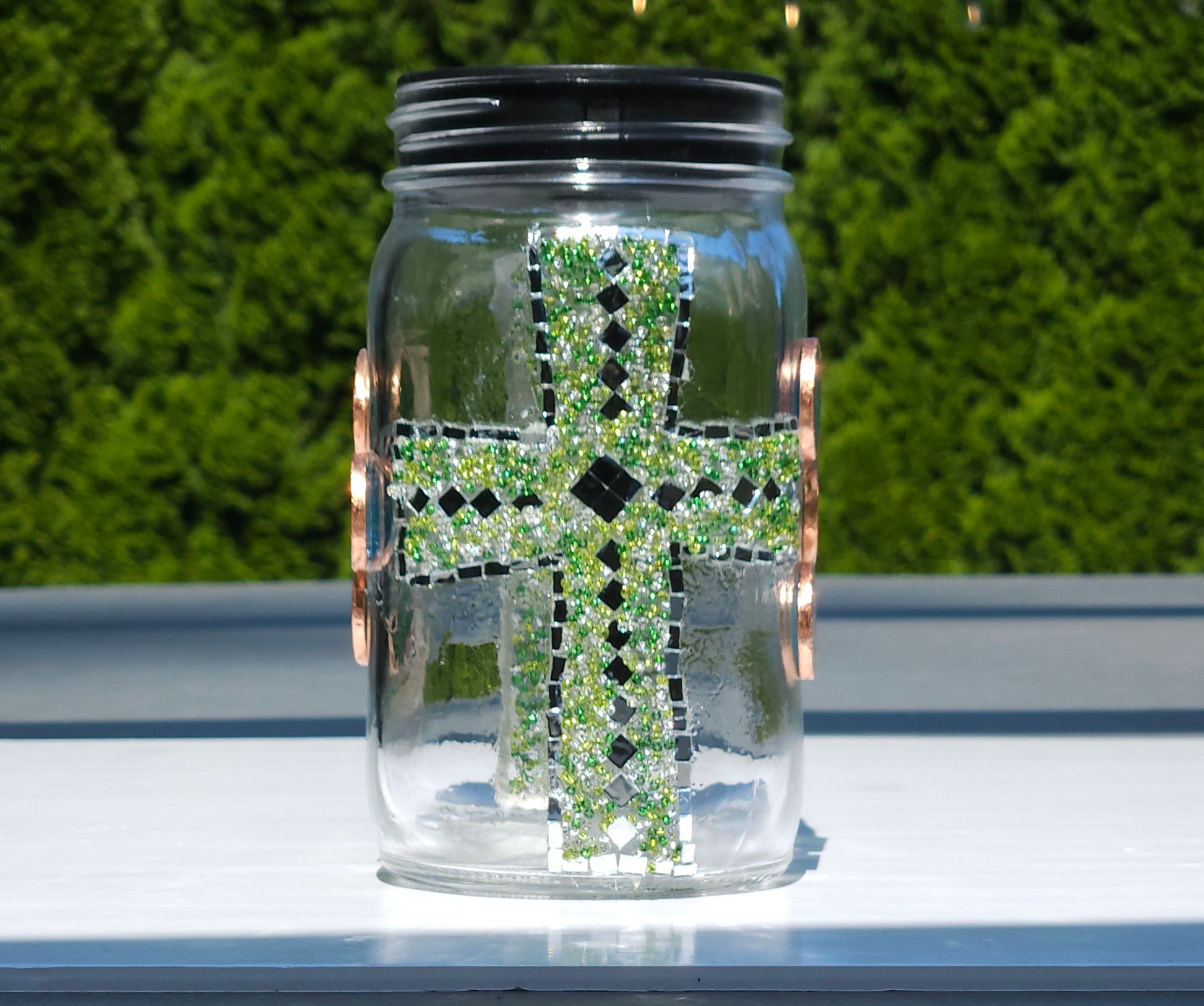 Handmade Mosaic Cross Solar Light Jar – Dark Green Glass Beads & Copper Accents