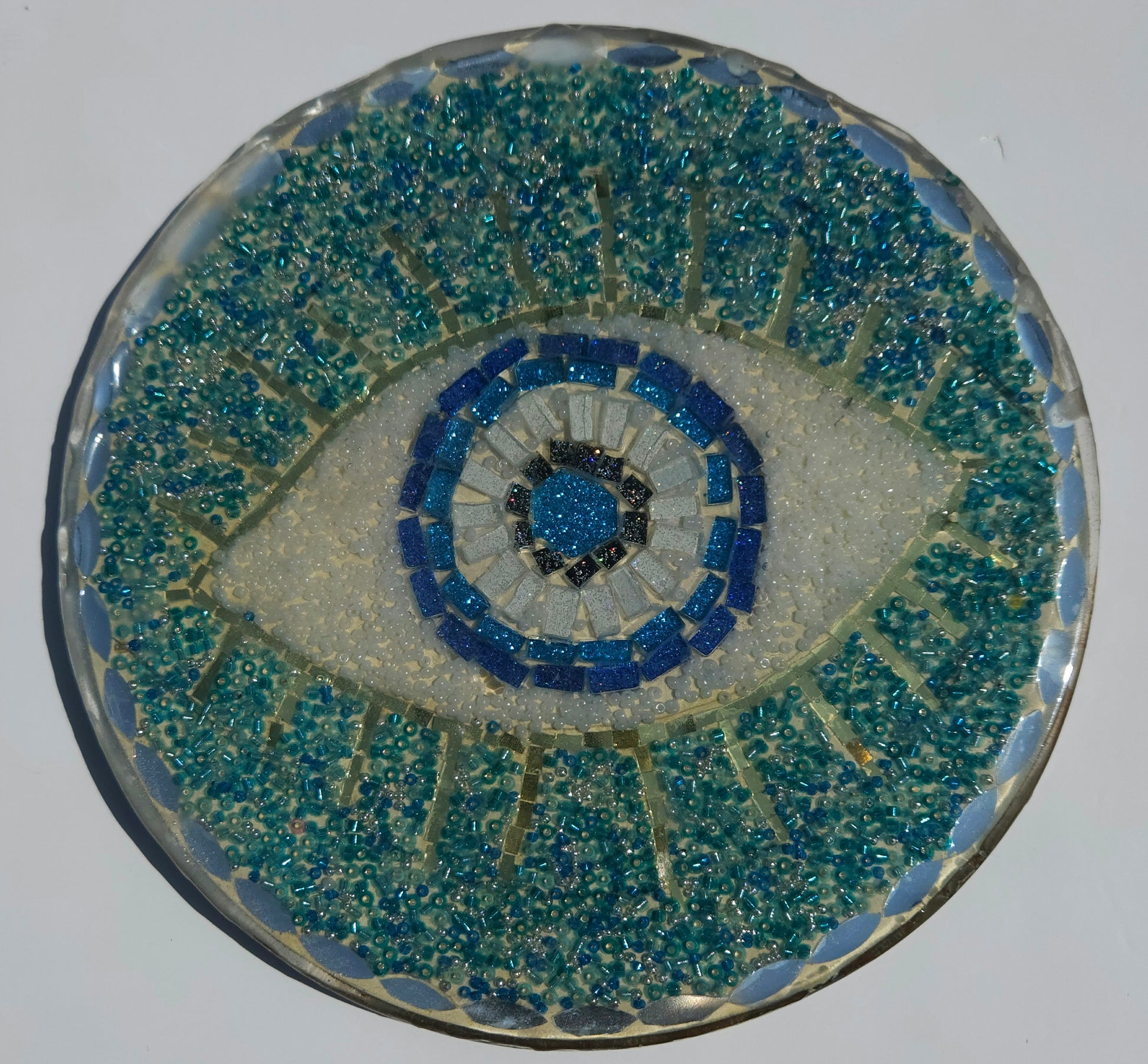 š¹ Design: Intricate layers of glass tesserae, glittered resin, and microbeads form a dazzling central eye surrounded by radiant rays.