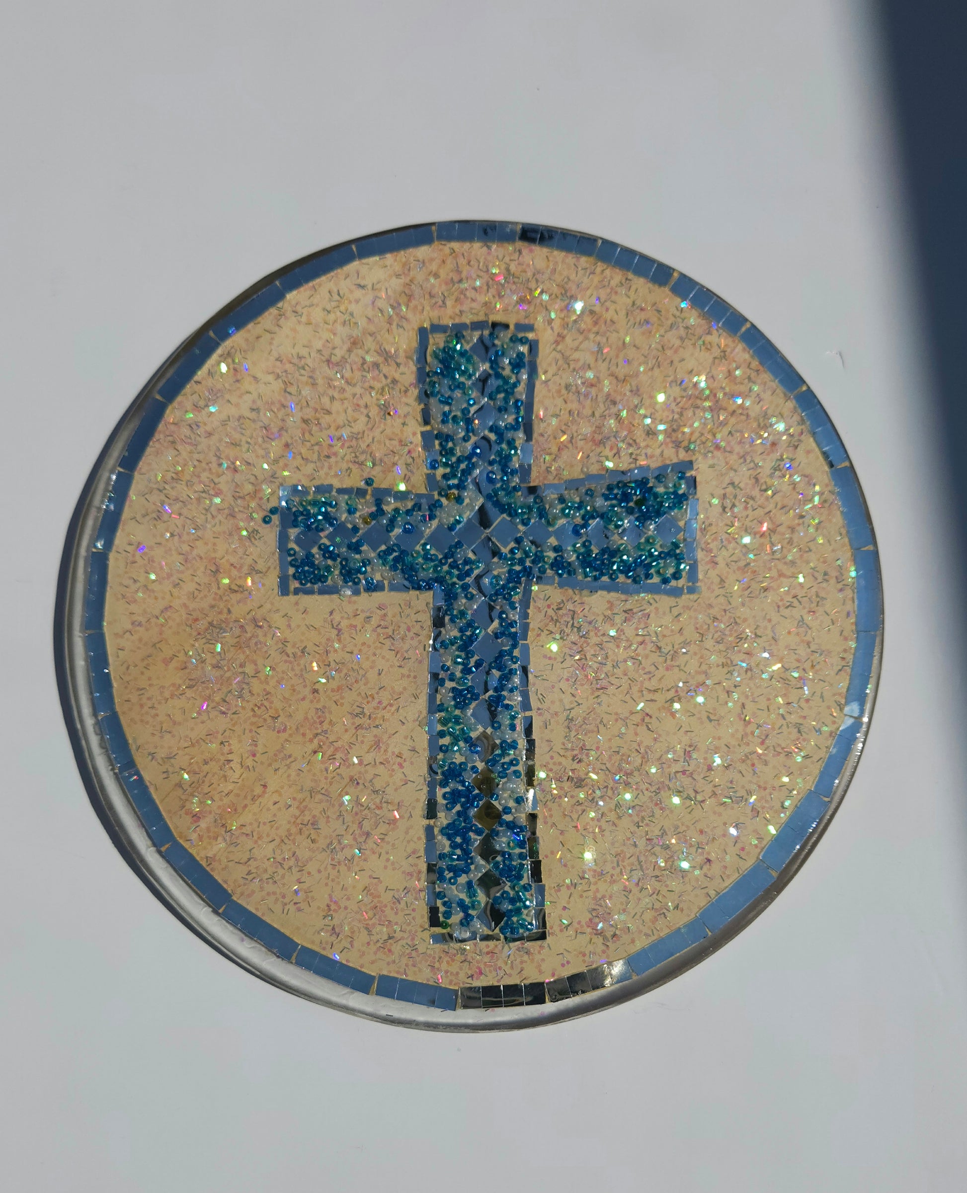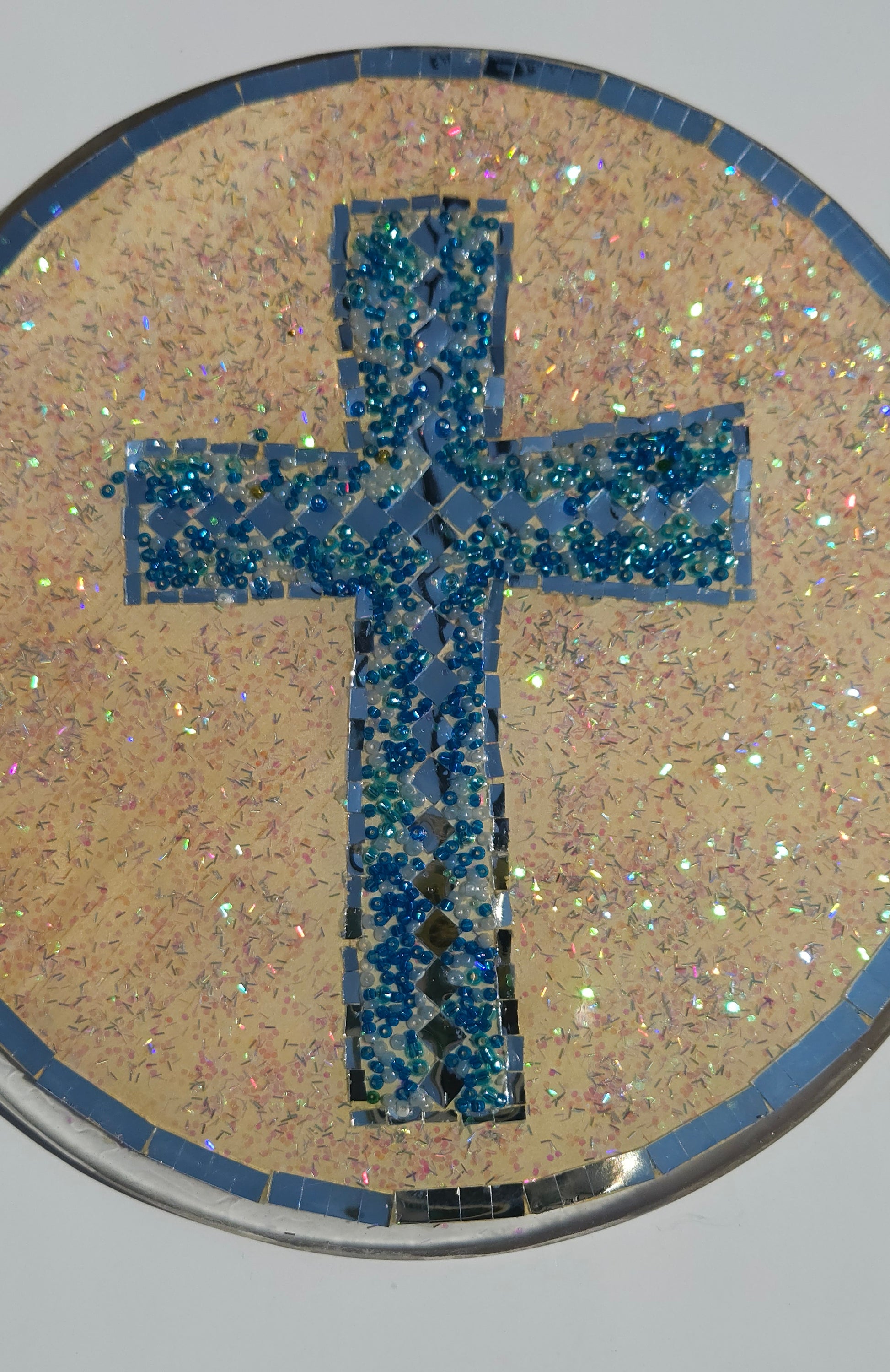 Celebrate faith and light with this handcrafted 8" round Cross Wall Hanging, designed in vibrant green glass beads and mirror-cut tiles, set against a shimmering iridescent background. Framed with a silver mosaic border and sealed in clear resin, this piece is a luminous expression of hope, healing, and divine grace.