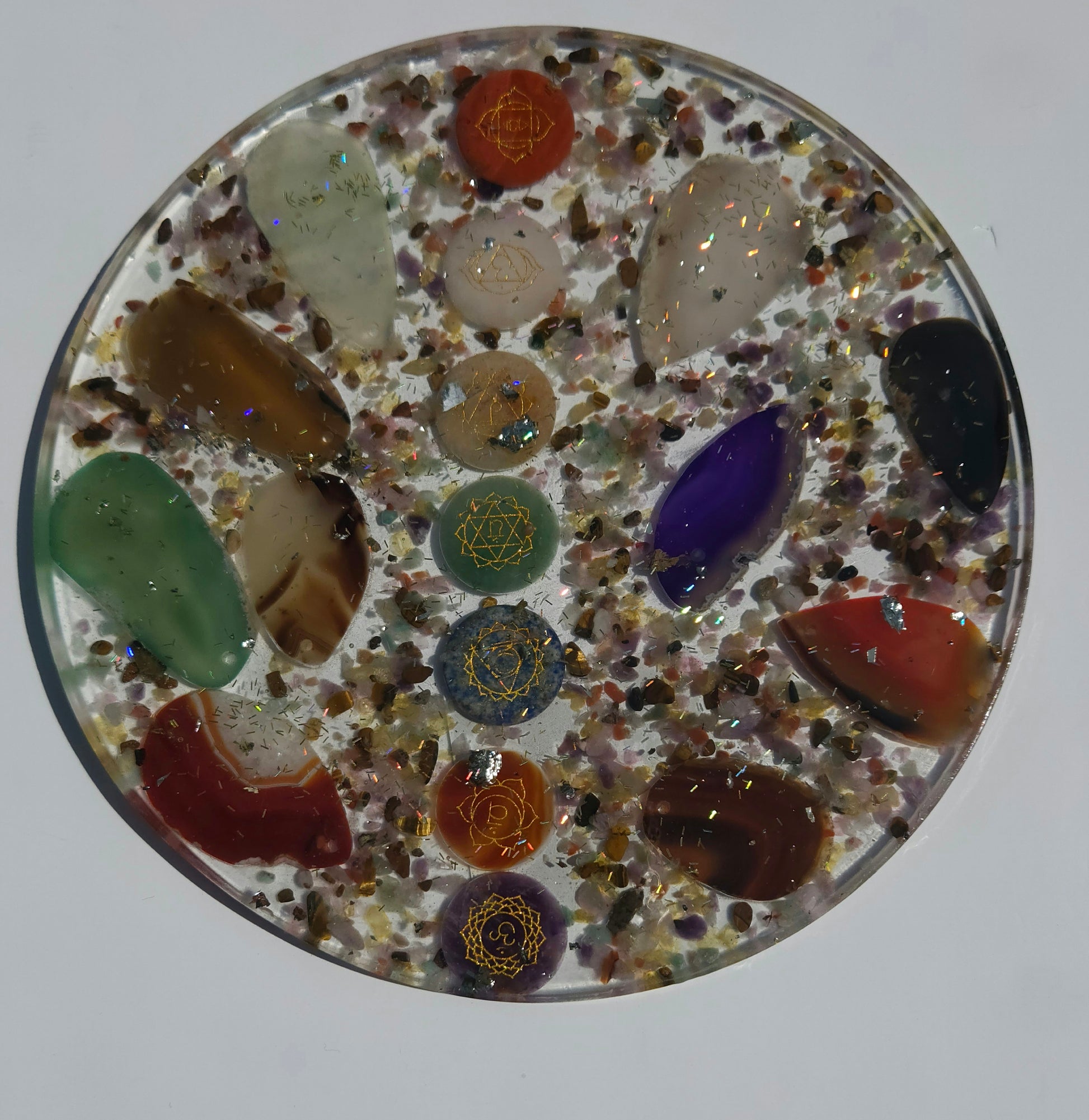 Invite harmony, healing, and higher consciousness into your sacred space with this handcrafted 8-inch round Chakra Crystal Grid. At the heart of this luminous creation lies a vertical alignment of 7 etched chakra stones, each representing the energy centers from Root to Crown. Surrounded by intuitively placed crystal chips, tumbled stones, and shimmering flecks, this piece is a radiant portal of light and intention.