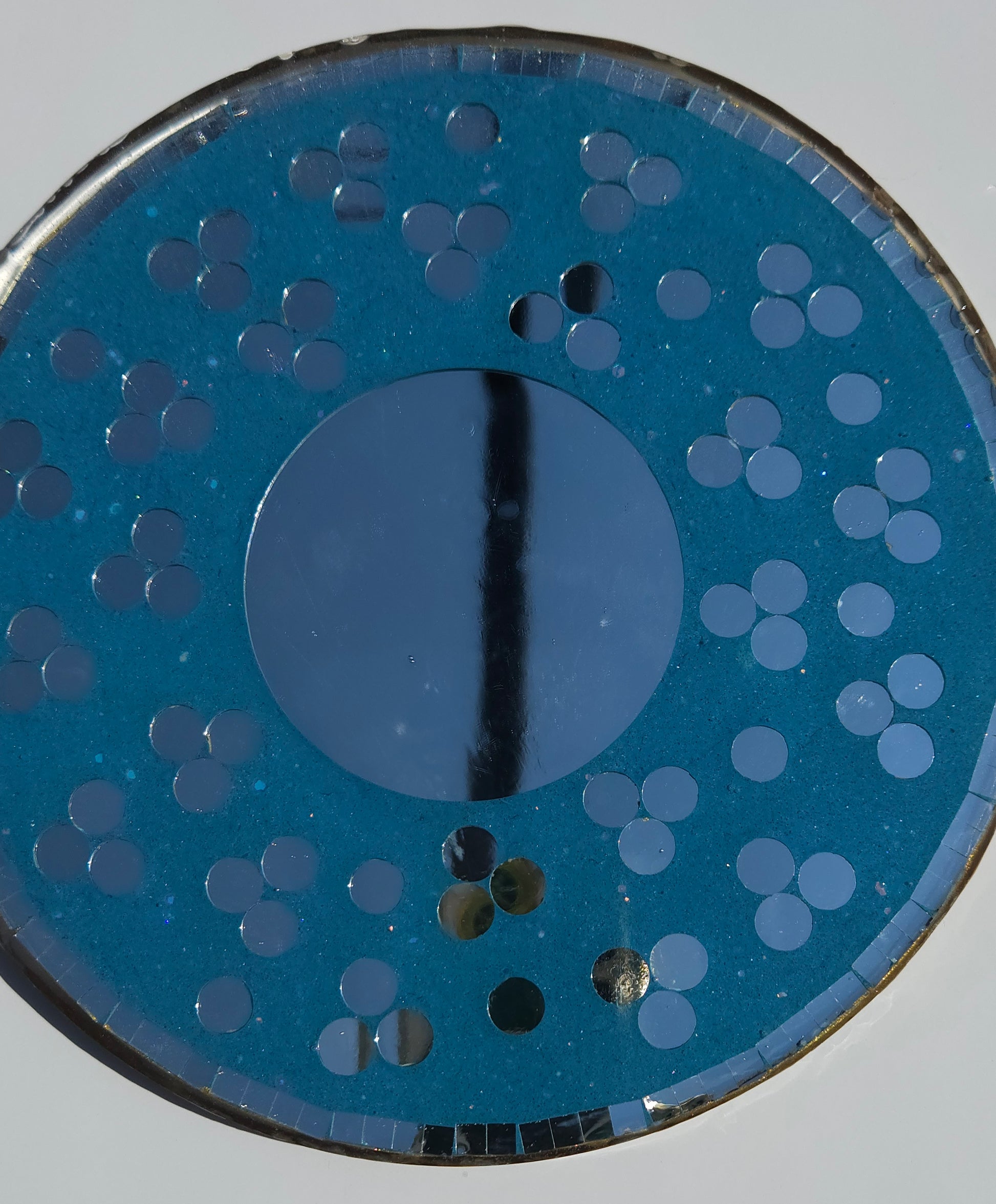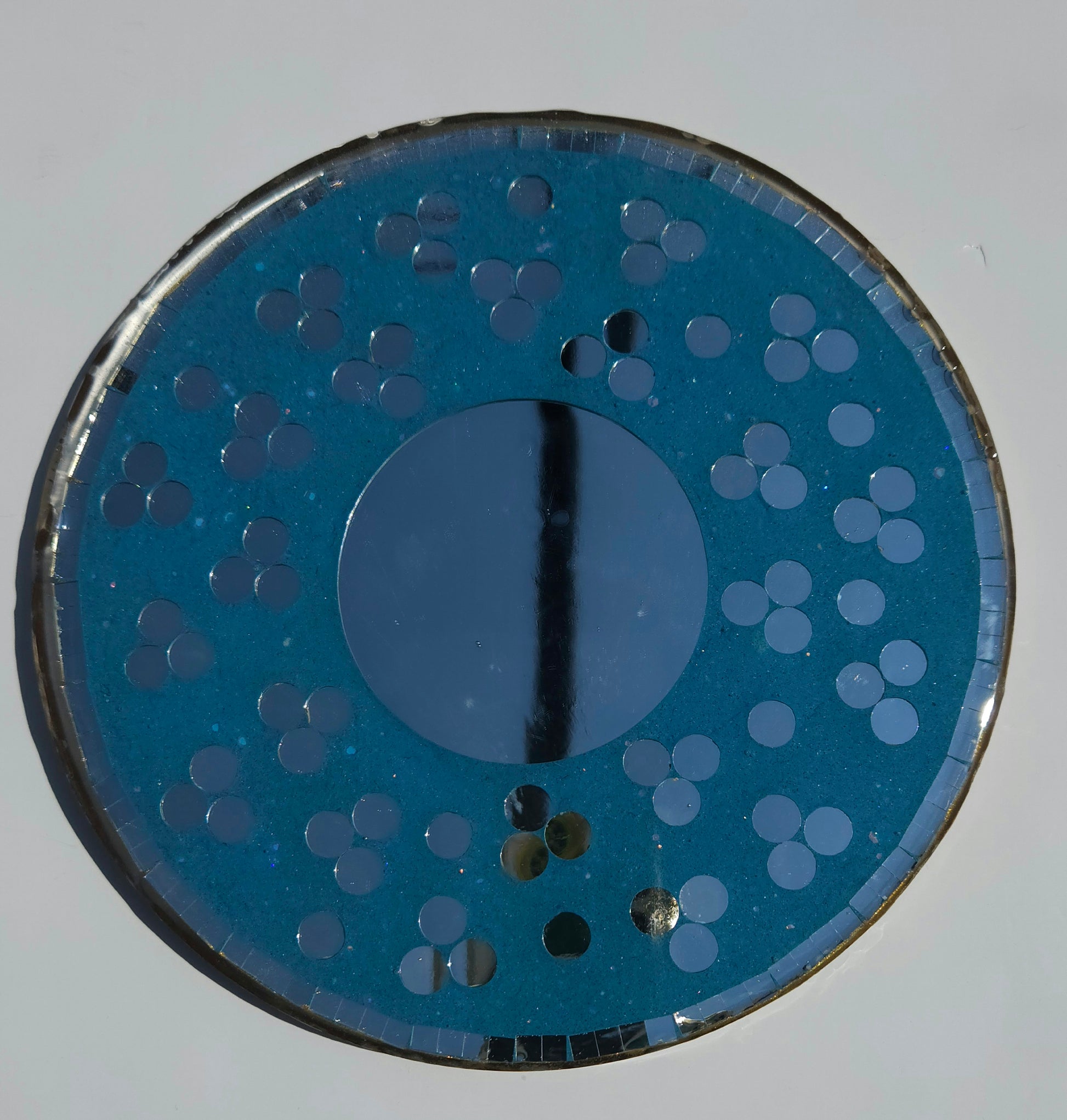 A central polished mirror circle anchors the design—perfect for small-space accenting, altars, side tables, or as a mini decorative wall piece. The contrast of the deep blue background with the shimmering mirror elements makes this item both timeless and modern.