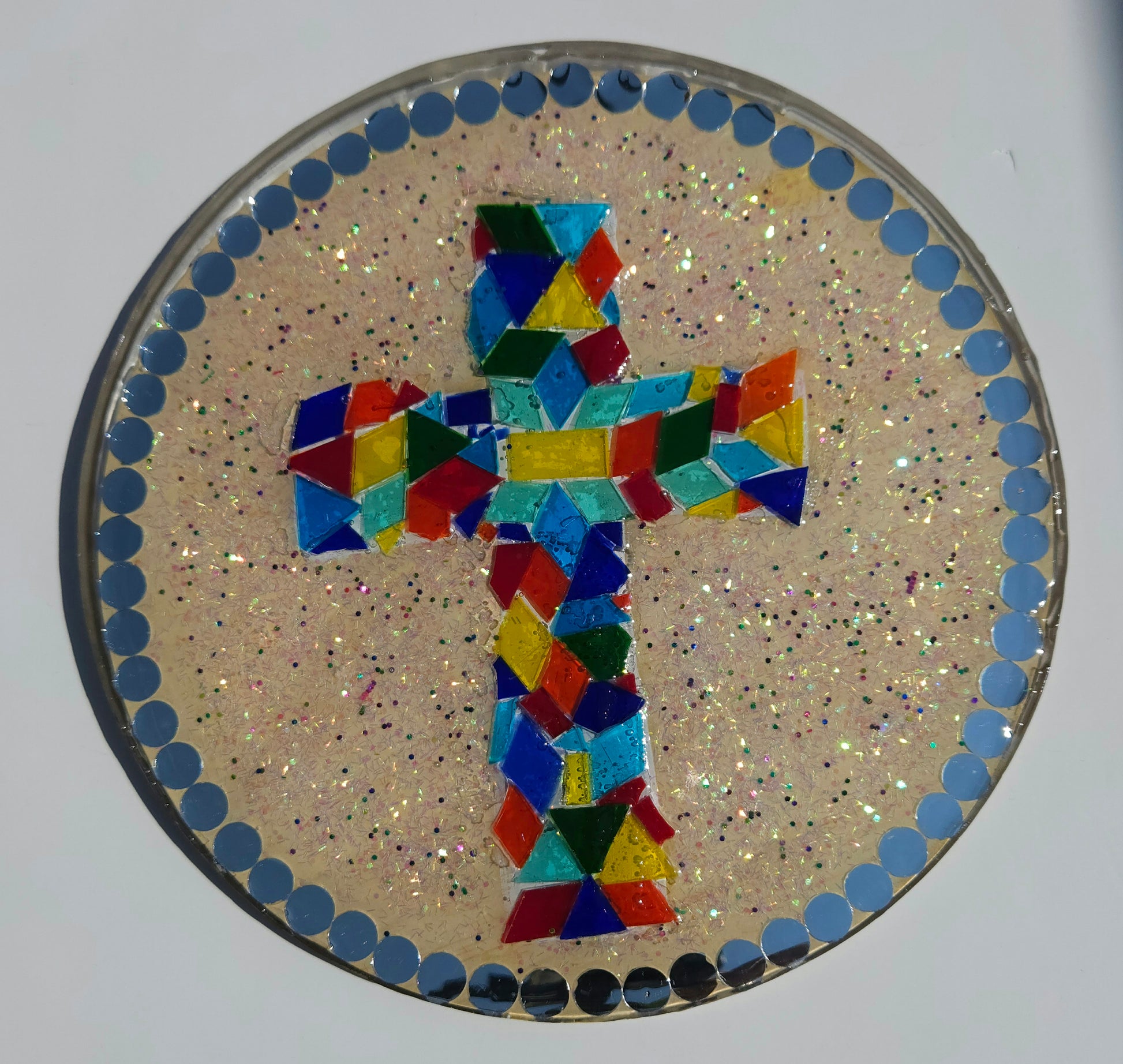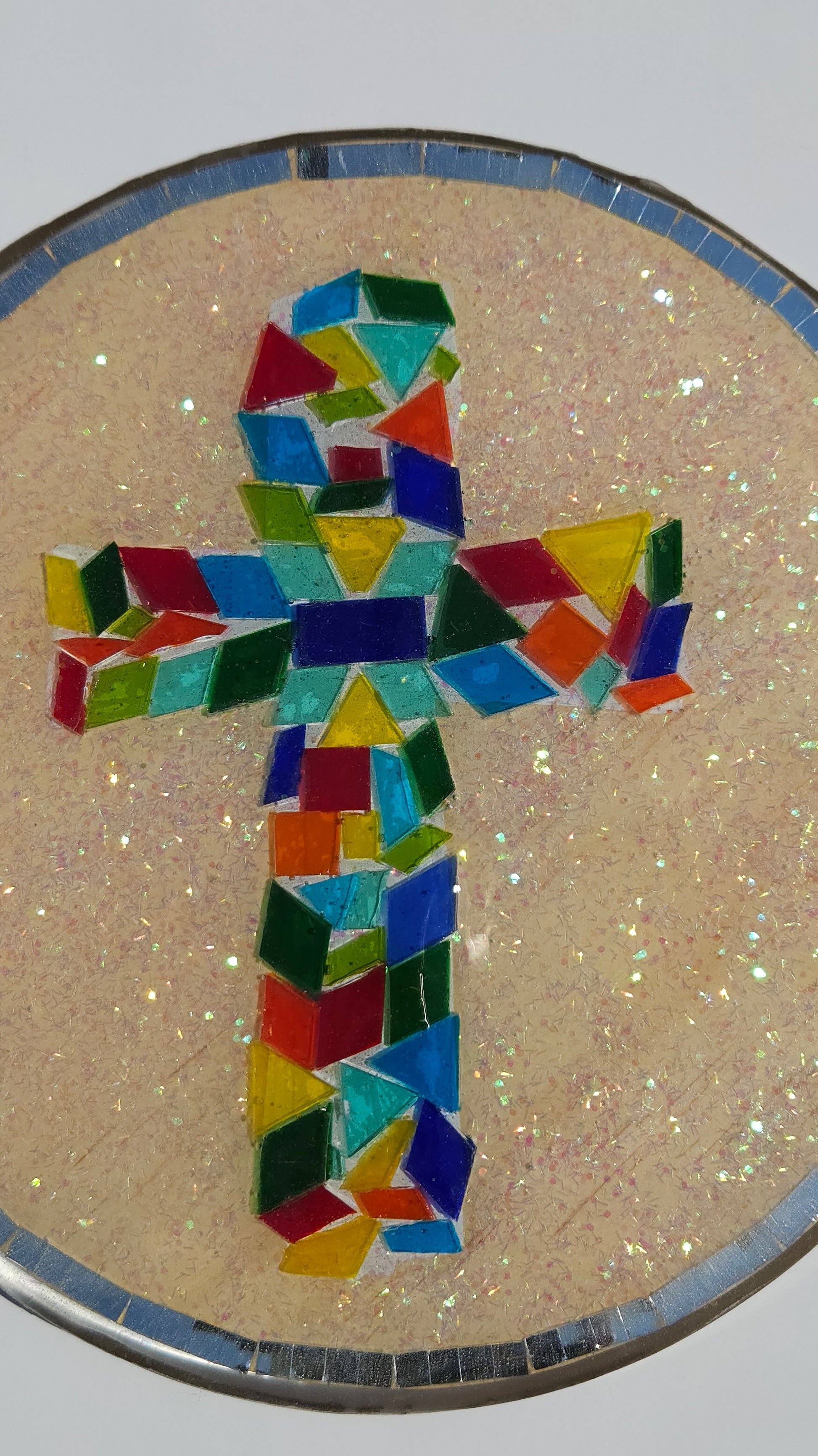 Radiating light and spiritual joy, this Stained Glass Rainbow Cross is a vibrant celebration of faith and color. Crafted by hand with stained glass-style mosaic tiles, this 8-inch round wall hanging evokes the beauty of cathedral windows — sealed in glossy resin and finished with an iridescent sparkle.