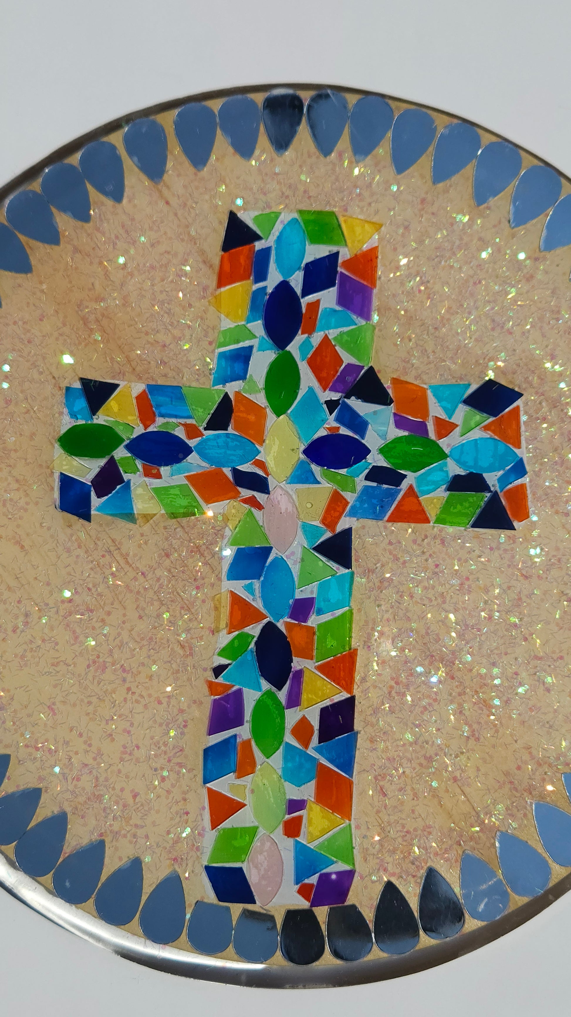 Each cross is made with multicolored tiles arranged in a one-of-a-kind design, framed by mirrored edging for a glowing, uplifting finish. Whether displayed in a sacred space, given as a meaningful gift, or hung in a sunlit window, this piece is a beautiful symbol of light, hope, and divine love.